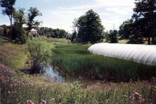 The wetland monitored under the SWAMP program in Aurora, Ontario is a surface flow wetland that treats runoff from an 82 hectare, predominantly residential, drainage area. The facility was originally constructed as a dry pond in 1988, but it evolved naturally into a wetland as moist soils created a suitable habitat for aquatic plants. Further modifications occurred in 1995 when an outlet structure was added to the facility prior to the study. This structure increased the time that solids could settle out by detaining runoff over a 3 to 5 day period as water in the facility was slowly released to the nearest watercourse. A heated greenhouse was installed in the wetland as part of the SWAMP study to assess the role temperature plays in wetland treatment and to evaluate potential solutions for enhancing performance during cold weather.