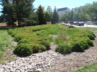 OBioretention is a stormwater infiltration practice that treats runoff from paved areas by using the natural properties of soil and vegetation to remove contaminants.  Other names commonly used for these types of practices includes rain gardens, bioswales, dry swales, stormwater planters and biofilters.  The practice has the potential to provide a significant improvement in contaminant removal over other stormwater infiltration practices due to the added treatment benefits of microbial activity and plant uptake.  By infiltrating and evapotranspiring runoff volumes, bioretention systems also help to reduce pollutant loads to watercourses and recharge groundwater.