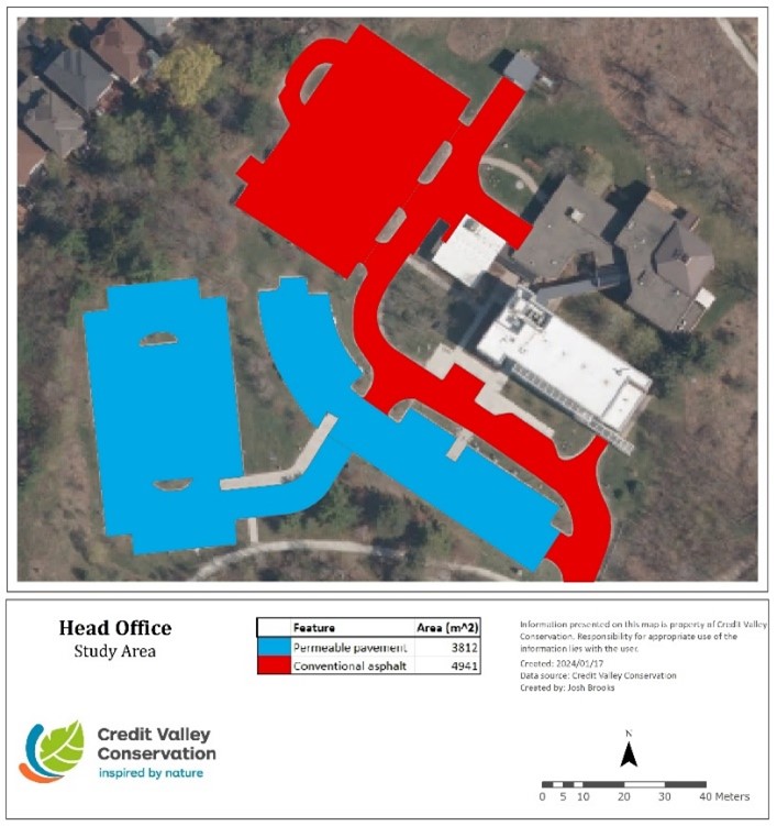 Figure 2. Map of Credit Valley Conservation Head Office. The two types of pavement are highlighted, conventional asphalt (red) and permeable pavement (blue)