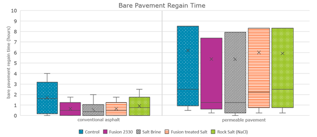 - Conventional asphalt takes less time to regain bare pavement compared with permeable pavement. This may be because ice or slush conditions are not always apparent on camera footage and will look like bare pavement.