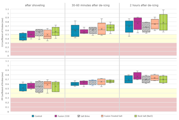 On PP, all anti-icing treatments’ median friction levels were in the safe range immediately after shoveling and before de-icing, maintaining high friction levels afterward. Although the de-icers were still applied to the plots, is important to note that for some events we achieved safe friction levels just by applying anti-icing and shoveling, even before bare pavement was fully regained. This suggests that de-icers may not be needed on PP in all circumstances and further chloride reductions can be achieved if only liquid anti-icing products are used. Fusion 2330 obtained the highest median friction two hours after shoveling and de-icing.