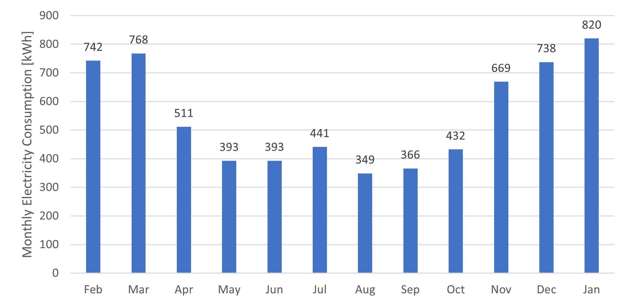 The total monthly electricity for my home from Feb 2023 to Jan 2024 is shown in Figure 2. I am on tiered electricity. Even with the HPWH and ASHP, I generally do not exceed the limits for the lower tier, which is 1,000 kWh for winter (Nov. 30th to April 30th) and 600 kWh for the rest of the year. The only month where I went slightly into the upper tier is November, and even then, by only a small amount.