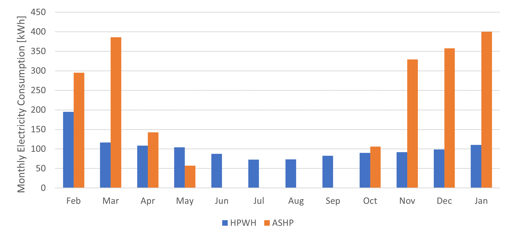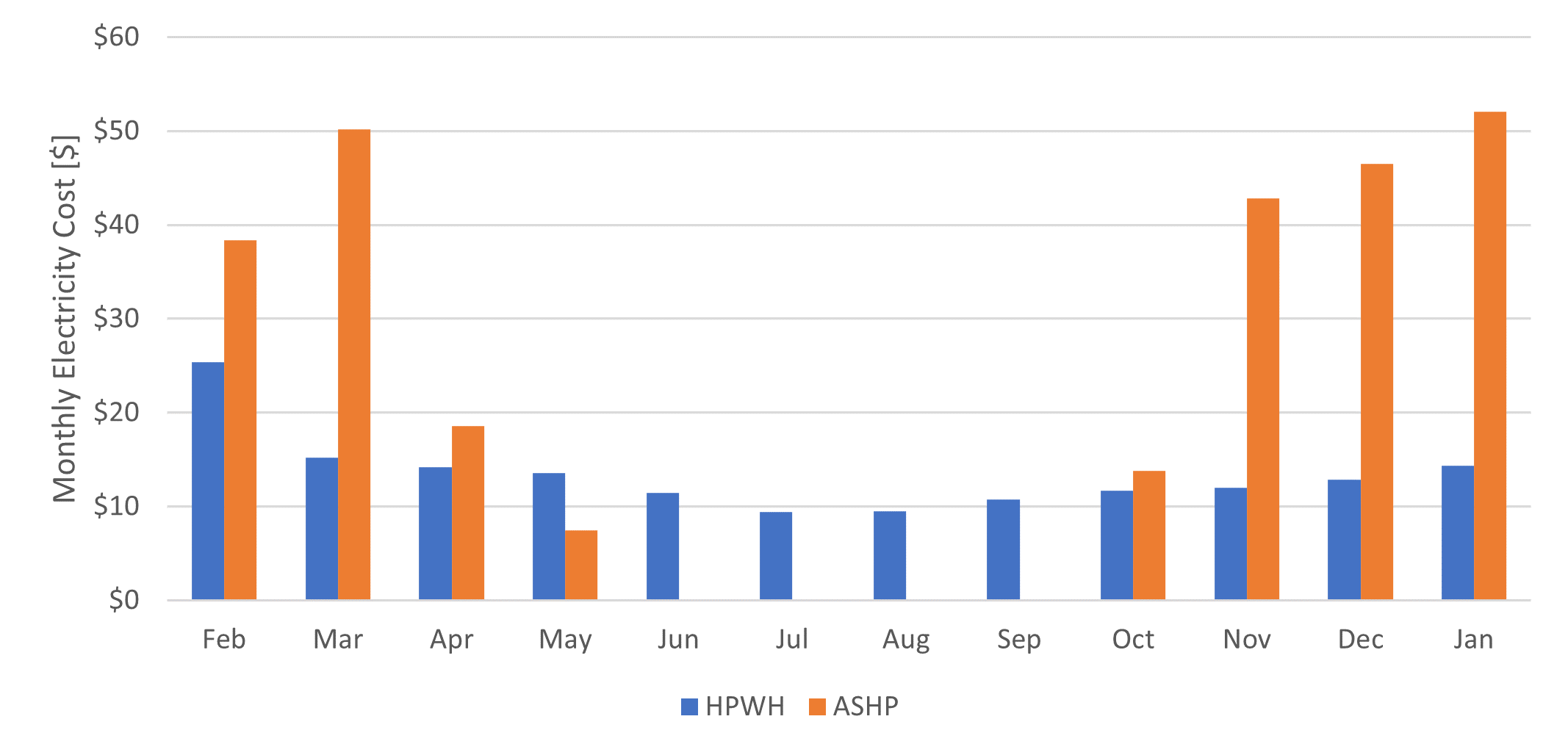 Figure 4. The monthly operating costs are shown for the ASHP and HPWH.