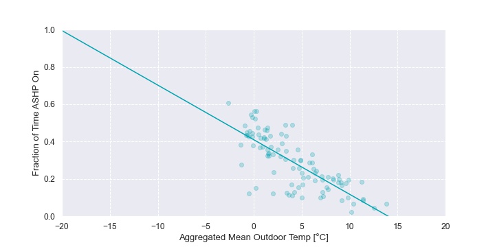 Figure 38 presents the fraction of time the heat pump was on as a function of the outdoor temperature. This data was aggregated on a 6-hour basis. It included only overnight operation and those hours where there was no furnace operation. For one data point, the CCASHP was operating 100% of the time in -10oC conditions and the overall trend predicts that it could continue to meet setpoint in slightly colder temperatures as well. Overall, the CCASHP is being used as much as it could, except for the furnace operation in a peak TOU.
