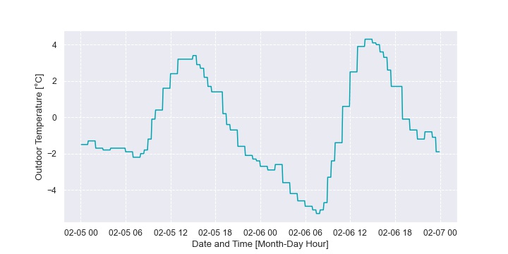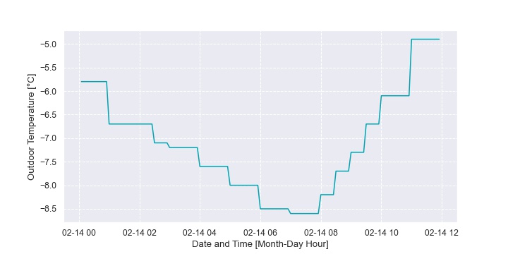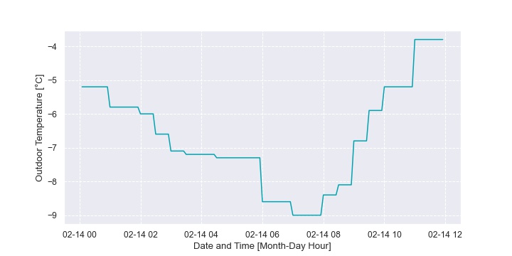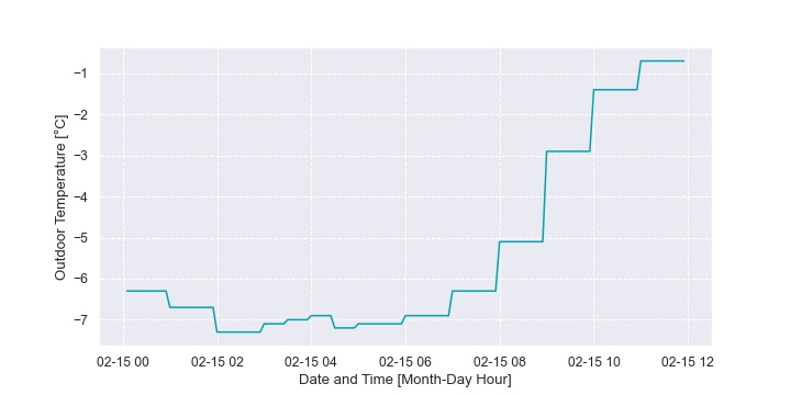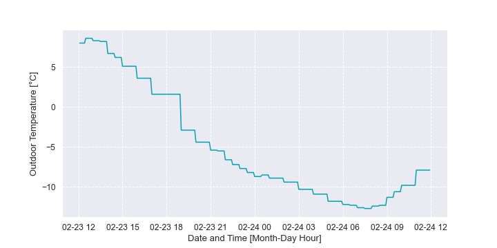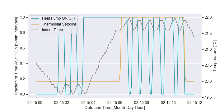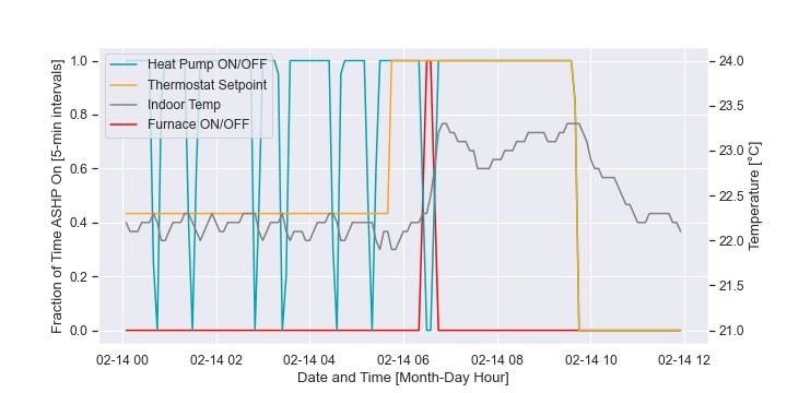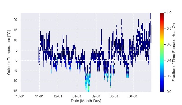 In this home, the back-up furnace operation was dependent more on the peak electricity TOU bracket than outdoor temperature. Figure 36 plots the fraction of time the furnace is on as a time series heat map. The hour of the day is on the vertical axis and the day of the year is on the horizontal axis. Each hour of each day is then represented as a block of color. The band of colour that is sometimes seen from 4pm to 9pm (16:00 to 21:00) is the peak TOU bracket. It isn’t seen every day because the homeowner also drops the setpoint during this bracket which allows the house to “coast” through without active heating to a certain extent. This is illustrated in Figure 37.