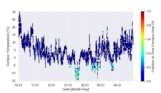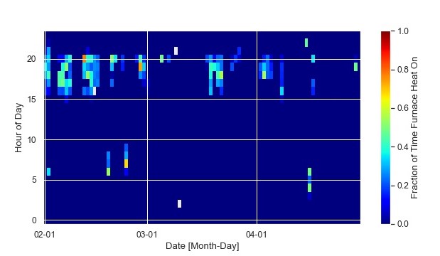 Figure 36. A time-series heat map shows the furnace operation for different hours of the day on different days of the year. The furnace operation in a peak TOU is shown as the band of colour on the top of the plot. The furnace is rarely on outside of that peak TOU.