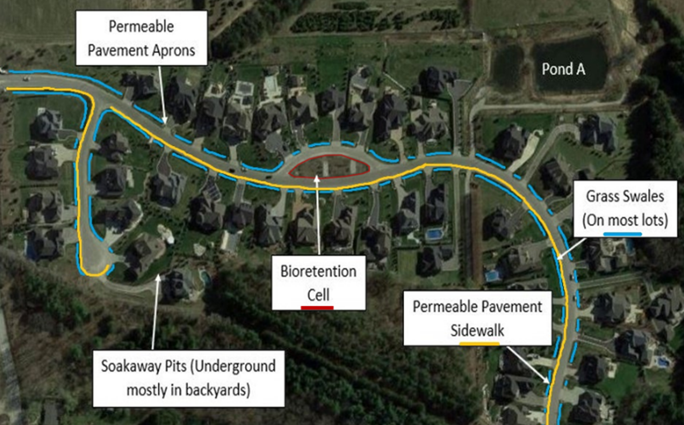 Aerial view of a subdivision with text and arrows indicating the location of permeable pavement aprons, soakaway pits, bioretention cell, permeable pavement sidewalks and grass swales.