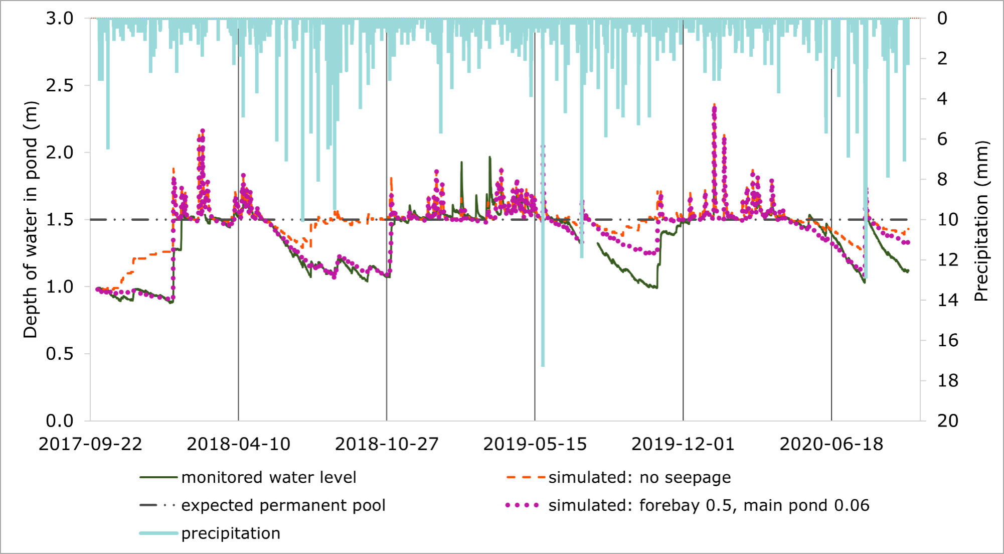 The seepage analysis was conducted to better understand the drivers behind the seasonal pattern in which the pond level stabilizes significantly lower than the permanent pool for much of the summer and fall. One possible reason why the pond level isn’t stabilizing at the permanent pool is because the pond liner may not be fully effective, causing seepage to the subsurface.