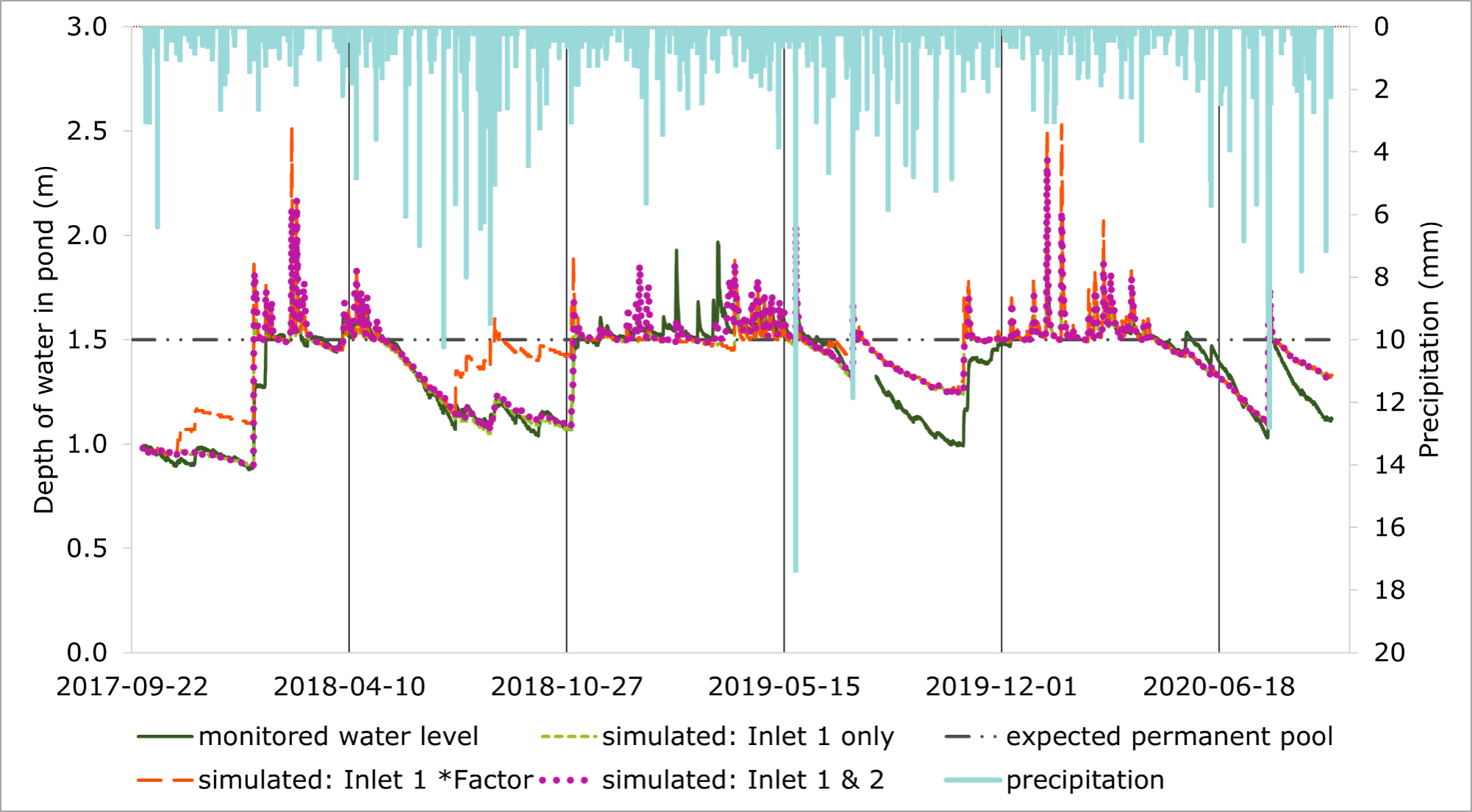 1. The model of Pond A and the small area that drains directly into the pond was set up using monitored inlet flow data and calibrated to monitored pond water levels and outlet flow.