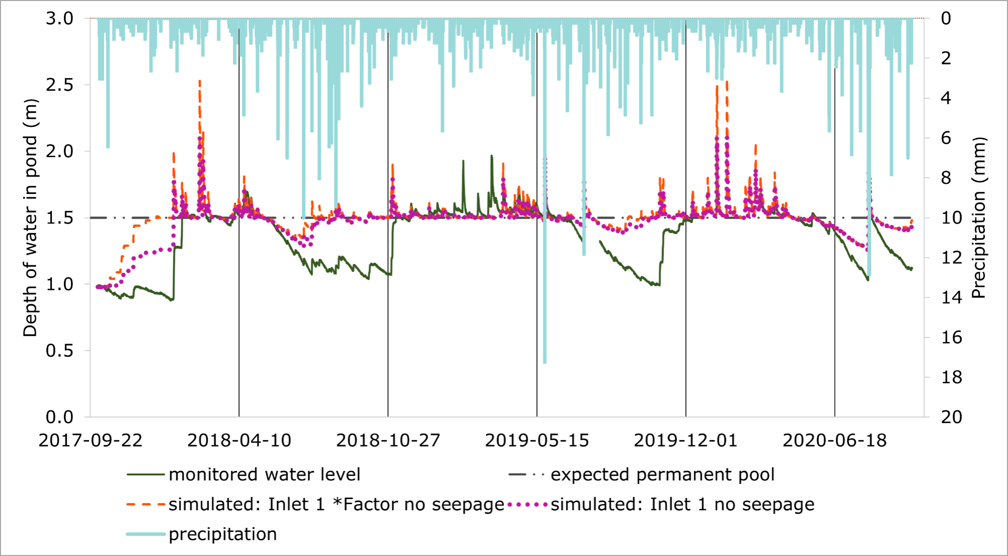 • Scenario b: Only monitored flow data from Inlet 1, direct precipitation and modelled runoff from the surrounding subcatchment were used. This scenario was run with both the seepage rate determined by the seepage analysis as well as with seepage set to 0. This scenario where the pond is only receiving runoff from the subdivision represents the flow volumes that Pond A was actually designed to treat.