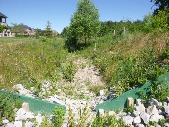 The subdivision is on lands previously owned by Sheridan Nurseries. Construction began in 2010 and continued through to 2014. Prior to development, the site was under active agricultural land use comprising non-native nursery stock, several plantations, a small woodlot, and some small patches of woodland and wetland. Sheridan Nurseries continue to cultivate commercial nursery stock on the neighbouring property. Under post-development conditions the eastern catchment, which includes 9.2 hectares of the MITG subdivision and 15.3 hectares from the adjacent Sheridan Nursery property, drains to the stormwater management facility (Pond A). Pond A is approximately 0.77 hectares and outlets to Tributary F. For additional site description and design criteria, refer to (Credit Valley Conservation, 2021).