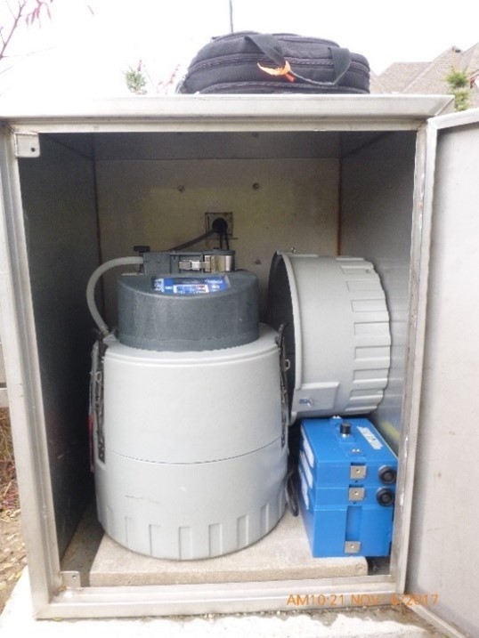 A metal box housing monitoring equipment including an ISCO autosampler and a 2150 ISCO Area-Velocity logger.
